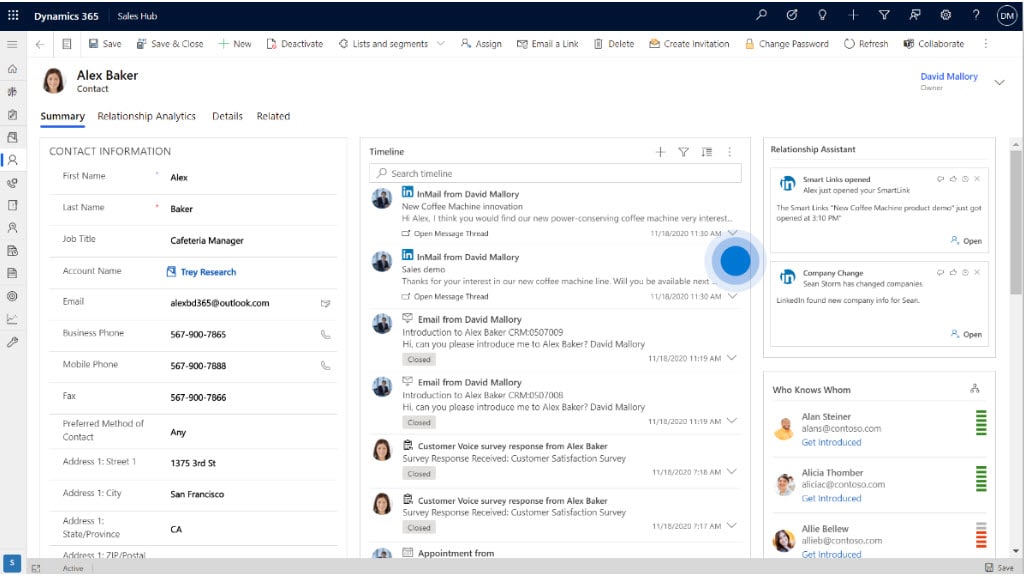 Nurture Connections with Data & AI. D365 CE uses built-in AI to help employees stay connected to customers. Integration with LinkedIn Sales Navigator brings relationship analytics into the D365 Sales Hub – keeping reps informed re: customer updates like job changes, upcoming IPOs, or new opportunities you should know about.